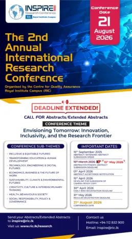 The 2nd Annual International Conference INSPIRE 2026, organised by the Centre for Quality Assurance (CQA) of the Royal Institute of Colombo (RIC), will be held on 21st August 2026. Building on the success of INSPIRE 2025, the 2026 conference will once again serve as a hybrid, multidisciplinary platform fostering interdisciplinary dialogue, global partnerships, and impactful research collaboration. Guided by the theme “Envisioning Tomorrow: Innovation, Inclusivity, and the Research Frontier,” INSPIRE 2026 highlights the importance of advancing new ideas, embracing diverse perspectives, and expanding the frontiers of knowledge to address contemporary global challenges. The conference represents a defining milestone in RIC’s evolution towards a research-driven and collaboration-oriented institution, reaffirming CQA’s leadership in nurturing a culture of research, innovation, and academic excellence across disciplines.